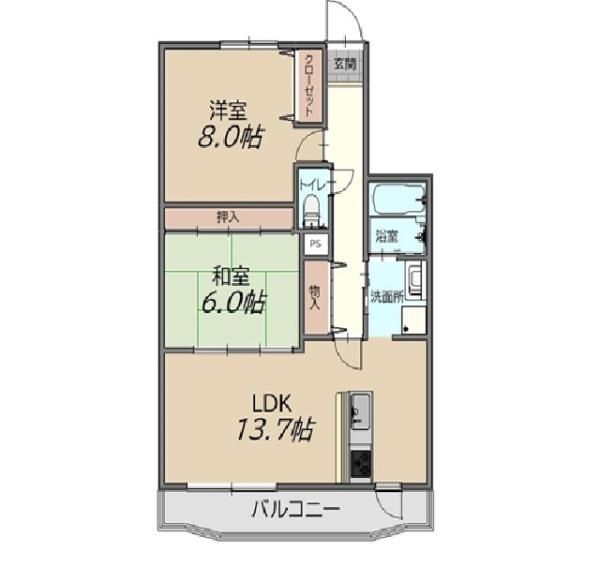| 築年月 | 1997年3月 | 間取り | 2LDK( LDK13.7畳/洋室8畳/和室6畳 ) | 専有面積 | 65.22m2 |