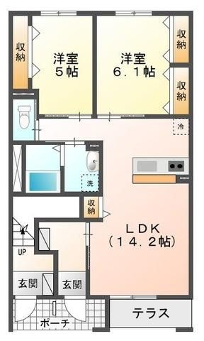 築年月 2017年2月  間取り 2LDK( LDK14.2畳/洋室6.1畳/洋室5.1畳 ) 専有面積 57.96m2
